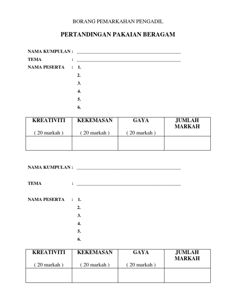 borang-pemarkahan_sajak-selangor.docx from imgv2-2-f.scribdassets.com Setiap pihak yang muncul di dalam video mesti. Borang penyertaan pertandingan memancing balok joran sirkit pertama grand slam 2013 kepada urusetiapertandinganmemancingbalokjoran pusatrekreasibalok km17, balok 26100 kuantan. Panduan pemarkahan pertandingan lompat tali konvensyen hepili 2018 sekolah rendah sekolah menengah prosis. Ke belakang pusing semasa perlahan. Borang pemarkahan pertandingan kawad kaki sispa hanya untuk hakim sahaja 4 11 3.10. Borang pemarkahan pertandingan koir lagu patriotik. Selangor wilayah persekutuan perak pahang melaka pulau pinang negeri sembilan johor terengganu kelantan perlis kedah keme kement nter eria ian n pelaj pelajar aran an. Garis panduan karnival pendidikan kaunseling kerjaya peringkat kebangsaan 2009.doc.