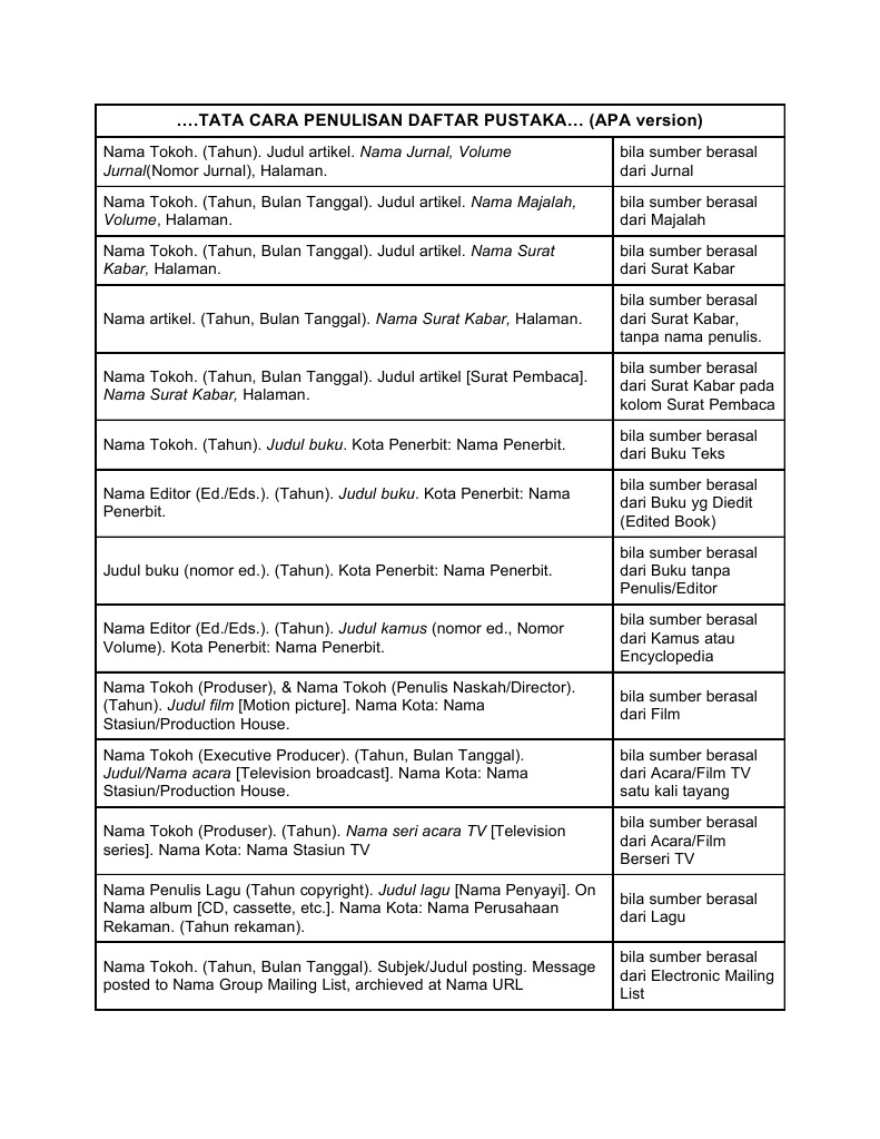 Apa 格式第六版。 學術論文寫作 apa 規範。 台北市華泰文化。 Apa sendiri merupakan kependekan dari american psychological association, sehingga apa styles merupakan salah satu bentuk sitasi yang dikeluarkan oleh organisasi apa terutama untuk bidang psikologi dan sosial. Format penulisan akademik halaman pengakuan halaman pengakuan mengandungi pengakuan tentang keaslian projek. Apa style requires brief references in the text of the paper and complete reference information at the end of the paper. The format of an apa reference differs depending on the source type. Apa requires you to include the publication year because apa users are concerned with the date of the article (the more current the better). Apa style suggests using a reference list for references cited in the text of a paper rather than a bibliography. Penulisan kutipan langsung kutipan langsung pada format apa ditulis. Play around with the options in the scribbr example generator to get familiar with apa style. Terdapat banyak lagi gaya rujukan di dunia termasuk harvard style, mla style dan chicago style. Apa (american psychological association) style • 2. Format dan struktur penulisan format kulit muka format kulit muka karya tulis ilmiah ( ukuran a4. The american psychological association (apa) developed its own model (apa style) in its in the format of reference source, according to apa style is divided into several methods and examples model american psychological association: